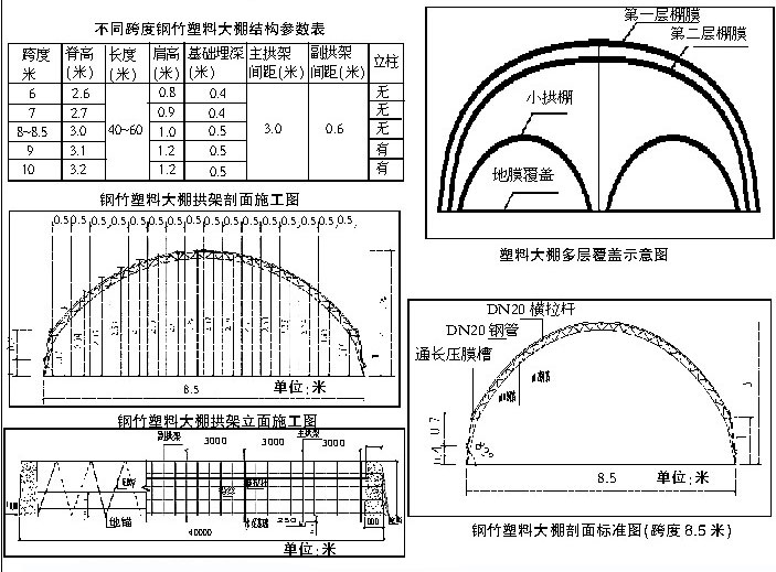 2.跨度钢竹塑料大棚的建造跨度以8.5米为佳,2根6米长的标准钢管刚好可以焊接成一副拱架。各地可根据地形适当调整跨度,控制在6~10米,但是如跨度过小,则相对投入成本过高,钢材材料浪费较大,如跨度超过9米,需增设中立柱。