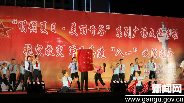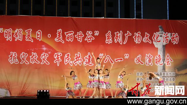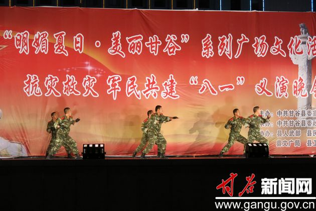 欢歌劲舞抒真情,军民情深写华章。为庆祝中国人民解放军建军86周年,振奋和激励全县干部群众抗灾救灾信心和希望,特殊时期。7月30日晚,甘谷县甘谷县举办“明媚夏日 美丽甘谷”系列广场文化活动系列之抗震救灾军民共建“八一”义演晚会。晚会全面展示了大灾面前全县人民不畏灾情、斗志昂扬的精神面貌。县委副书记、县长申君明,县委常委马骥、邵宏伟、董珺,县人武部部长权亚飞等领导,县双拥工作领导小组成员单位负责人,驻甘谷部队全体官兵,县政法系统全体干部及我县数千名观众共同观看了演出。