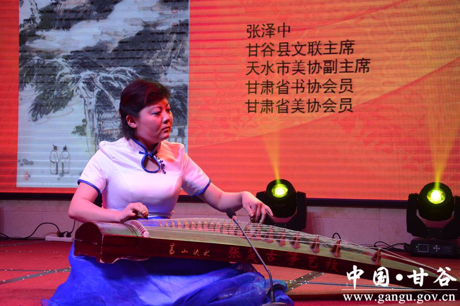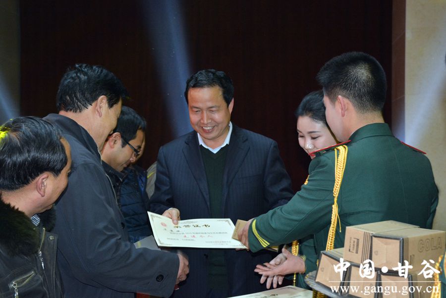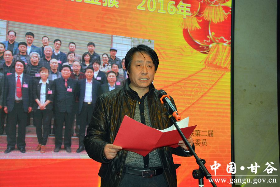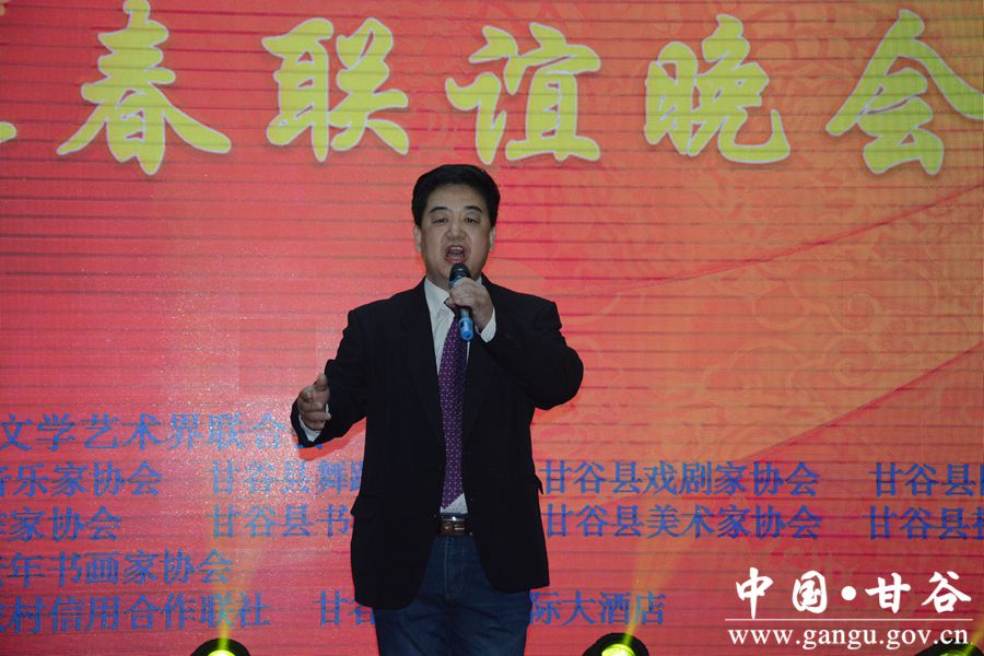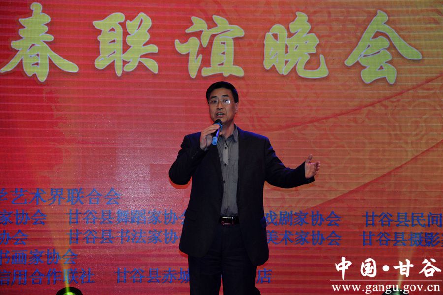 张庆元代表县四大组织在晚会上致辞,他说,2015年,全县文艺界认真贯彻《中共中央关于繁荣发展社会主义文艺的意见》以及习近平总书记在文艺座谈会上的讲话精神,围绕中心、服务大局,突出特色、创新工作,全县广大文艺工作者积极投身改革发展的伟大实践,以贴近实际、贴近生活、贴近群众为原则,为人民抒写、为人民抒情、为人民抒怀,创作出了一大批弘扬时代精神、形式风格多样,有较高思想性和艺术性的优秀文艺作品,为人民群众提供了健康向上的精神食粮。县文联充分发挥牵头引领作用,先后举办了《书法报》走进甘谷系列活动、庆元旦摄影展、建党94周年书画展、清风甘谷廉政书画展等一系列颇具影响力的活动,并组织县内文艺工作者深入多个乡镇开展了“三下乡”、“送欢乐下基层”等丰富多彩的文艺下乡活动,深受广大人民群众欢迎,为全县精神文明建设和文艺事业繁荣发展做出了积极的贡献,为建设文化强县奠定了坚实的基础。